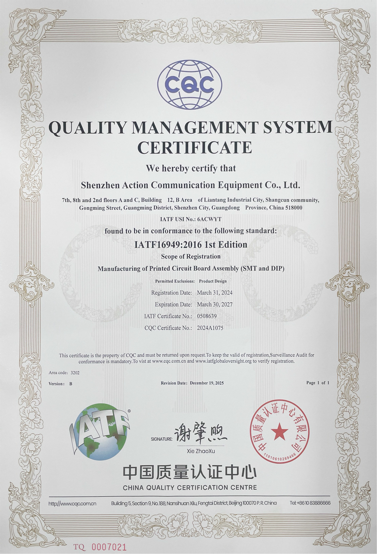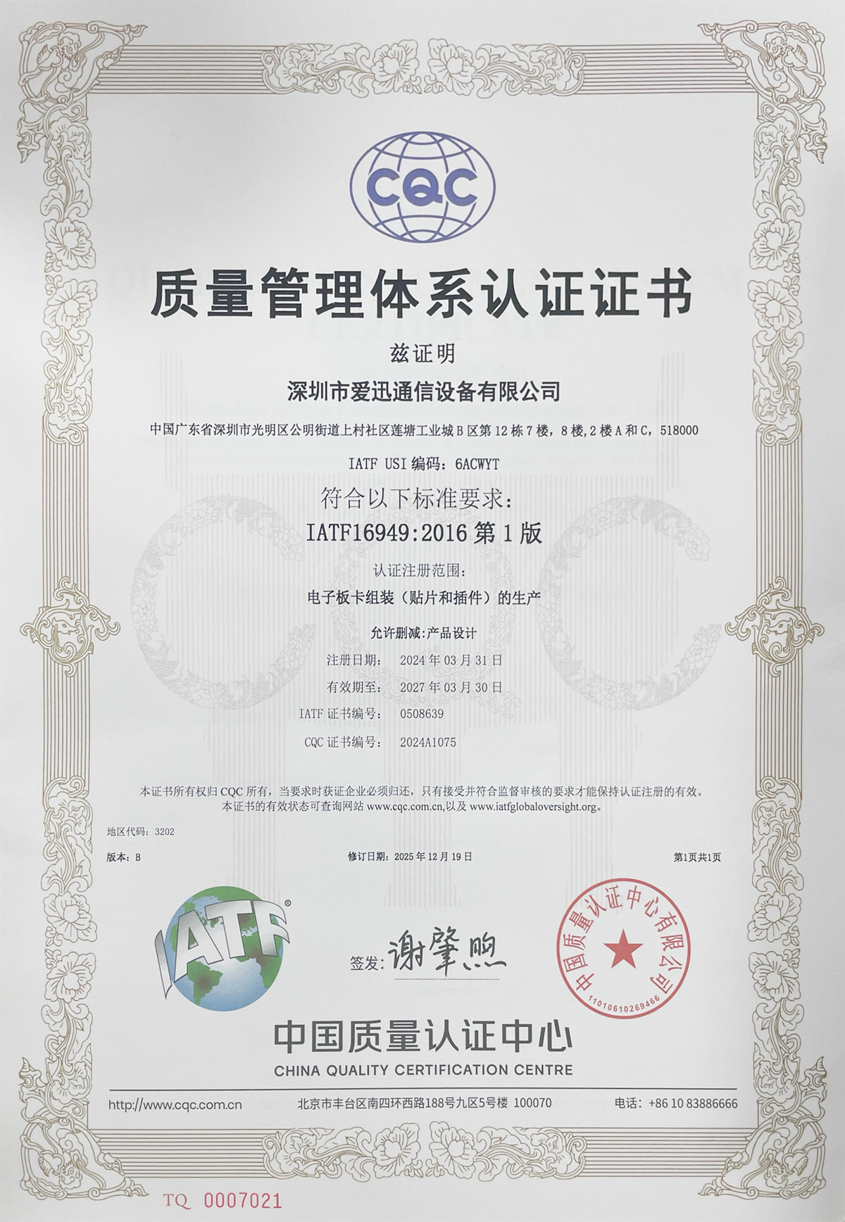 IATF16949质量管理体系认证证书(中文版)